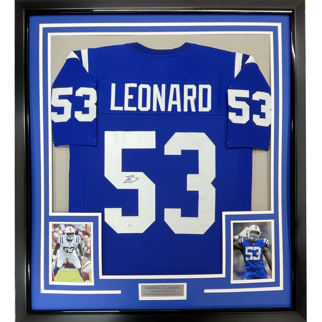 Framed Autographed/Signed Darius Shaquille Leonard 35x39 Indianapolis Blue Football Jersey JSA COA