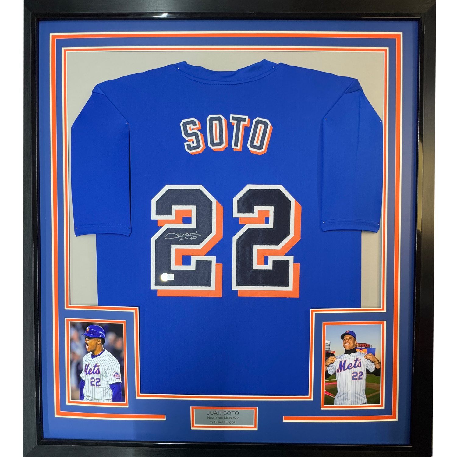 Framed Autographed/Signed Juan Soto 35x39 New York Blue Baseball Jersey Beckett BAS COA
