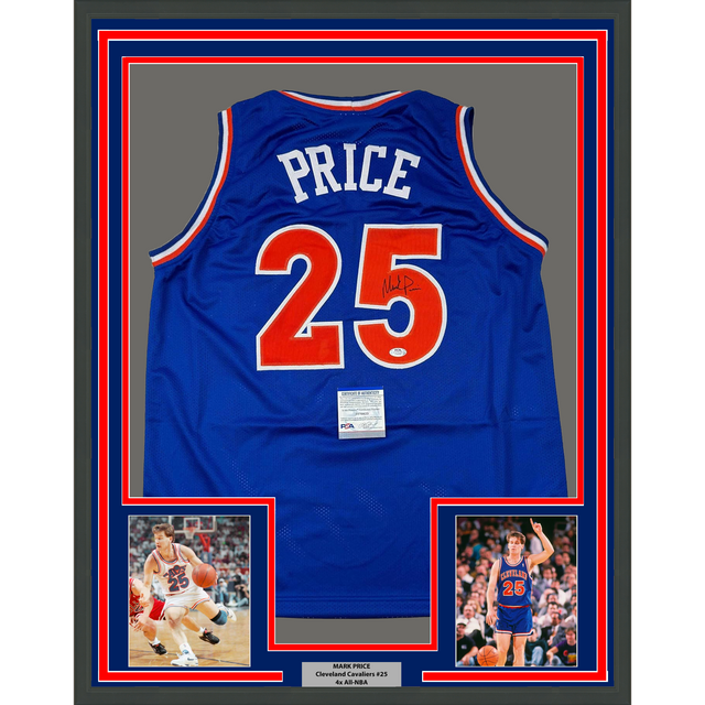 Framed Autographed/Signed Mark Price 35x39 Cleveland Blue Basketball Jersey PSA COA