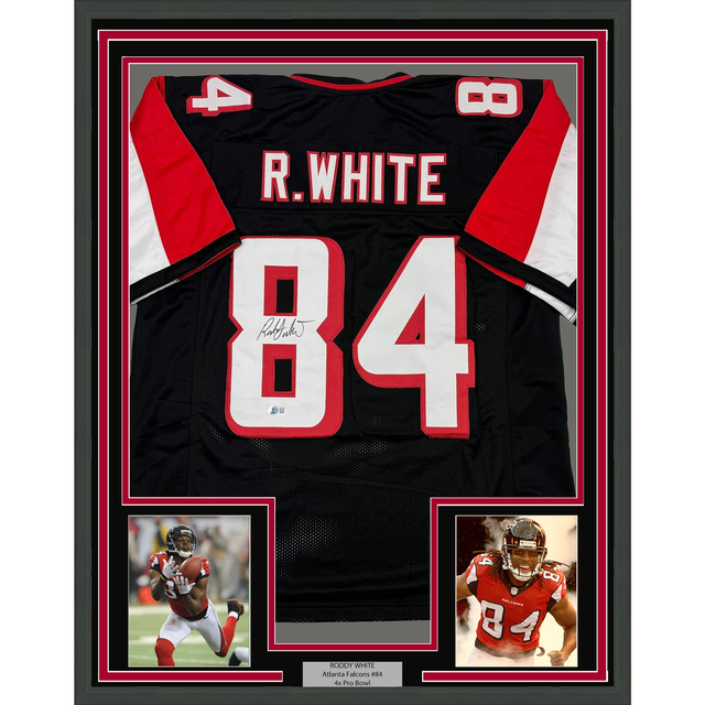 Framed Autographed/Signed Roddy White 35x39 Atlanta Black Football Jersey Beckett BAS COA