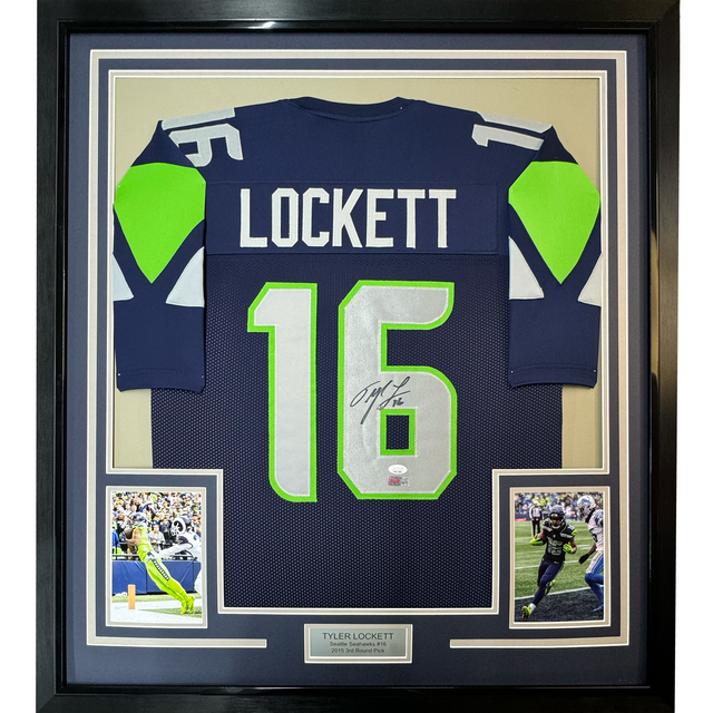 Framed Autographed/Signed Tyler Lockett 35x39 Seattle Blue Football Jersey JSA COA