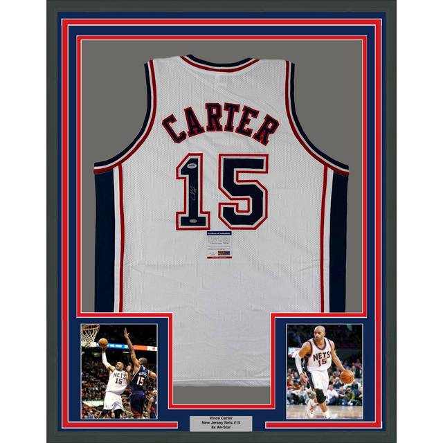 Framed Autographed/Signed Vince Carter 35x39 New Jersey NJ White Basketball Jersey PSA/DNA COA