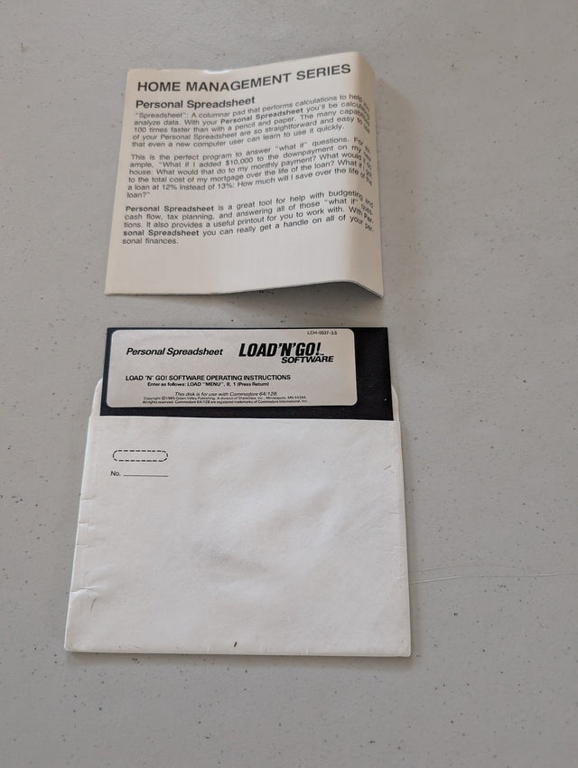 Personal Spreadsheet LOAD'N'GO! software floppy disk for Commodore 64/128 with instructions 1985
