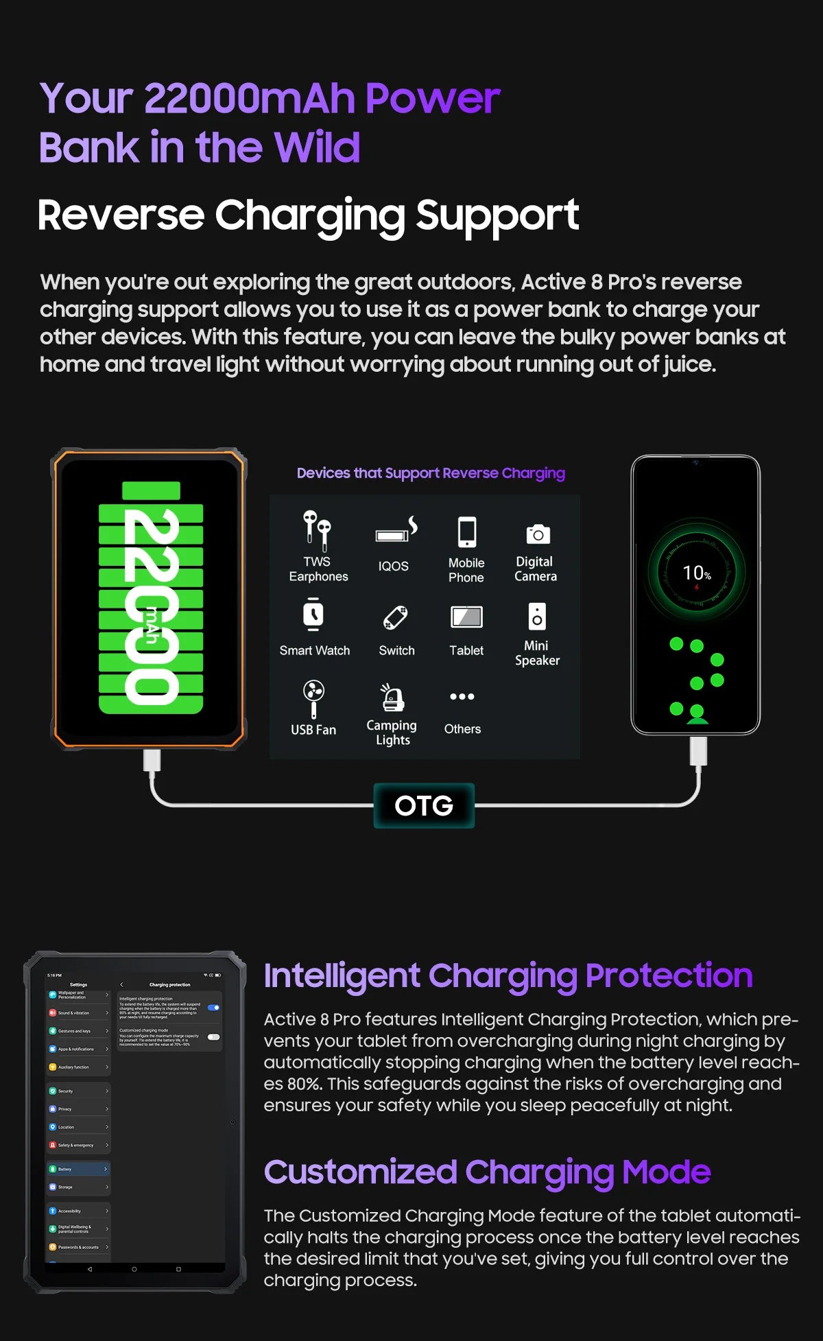 Boostez votre Active 8 Pro avec une charge ultra-rapide de 33 W, adaptée à votre style de vie actif en plein air. Et quand vous êtes prêt à passer à l'action, l'Active 8 Pro est à vos côtés ! En seulement 285 minutes, cette puissante batterie de 22 000 mAh atteint sa pleine capacité, vous assurant des aventures ininterrompues qui peuvent durer des jours, voire des mois.
