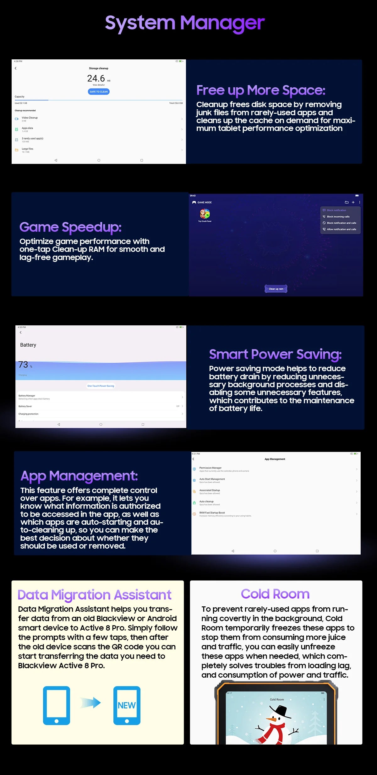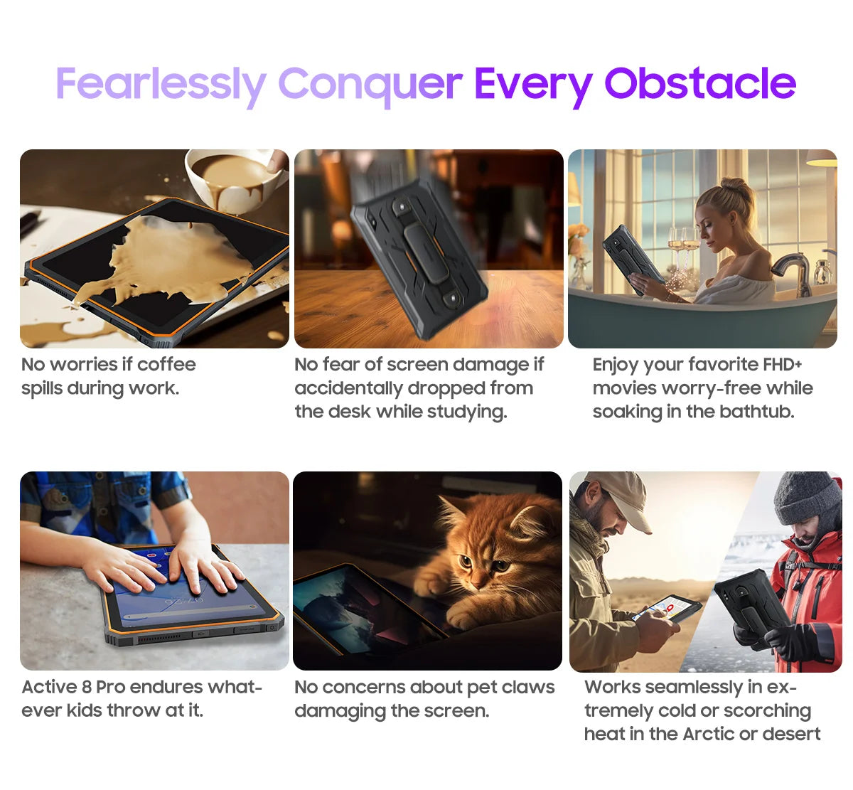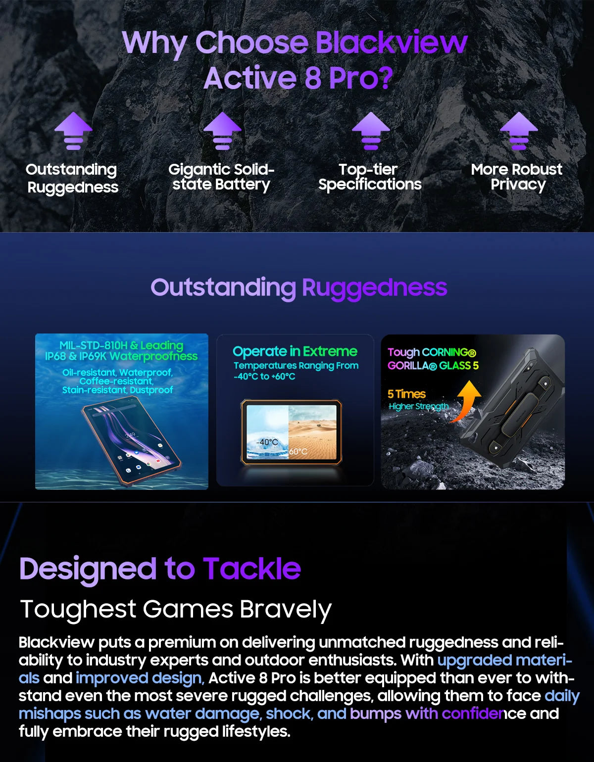Avec la dernière révision de la norme MIL-STD-810H, l'Active 8 Pro a été amélioré par Blackview pour offrir une protection inégalée contre les environnements difficiles tels que l'eau, la poussière et les chutes. Avec la tranquillité d'esprit et la confiance nécessaires pour relever tous les défis, cet appareil est fiable en toutes circonstances.
