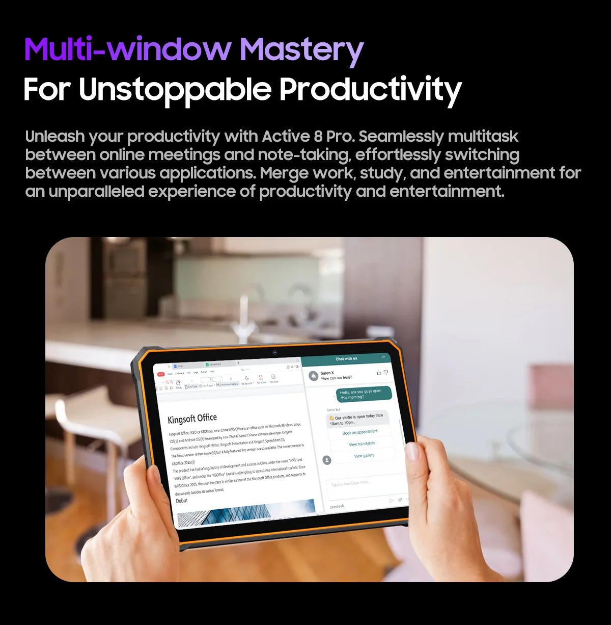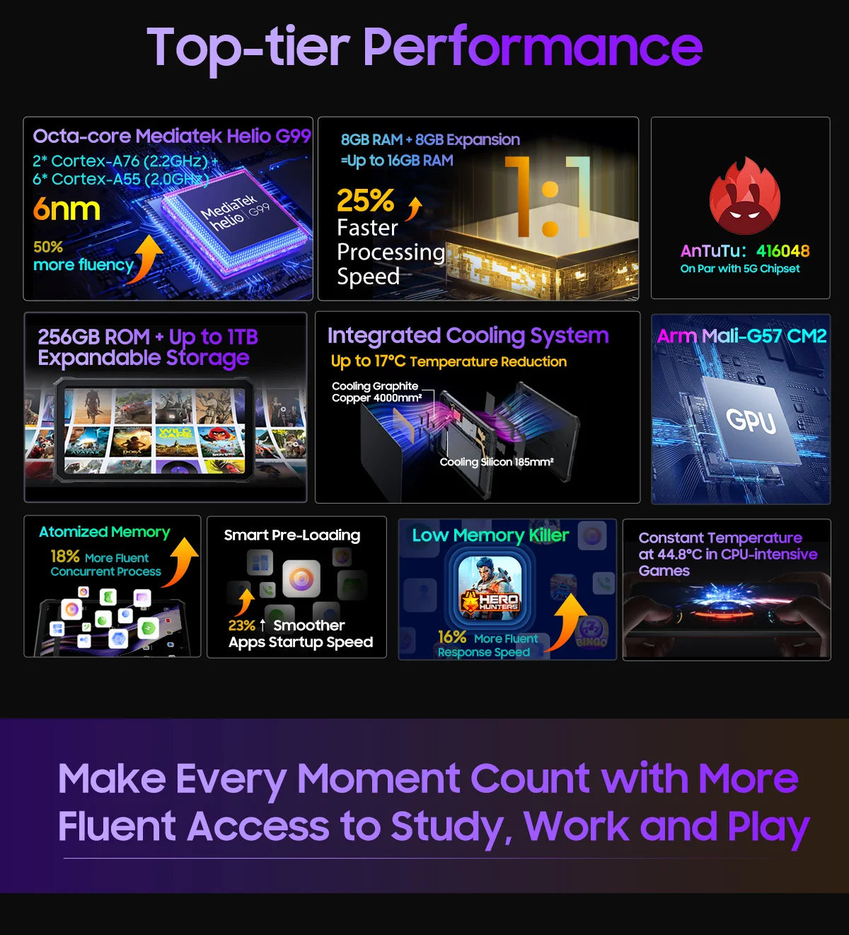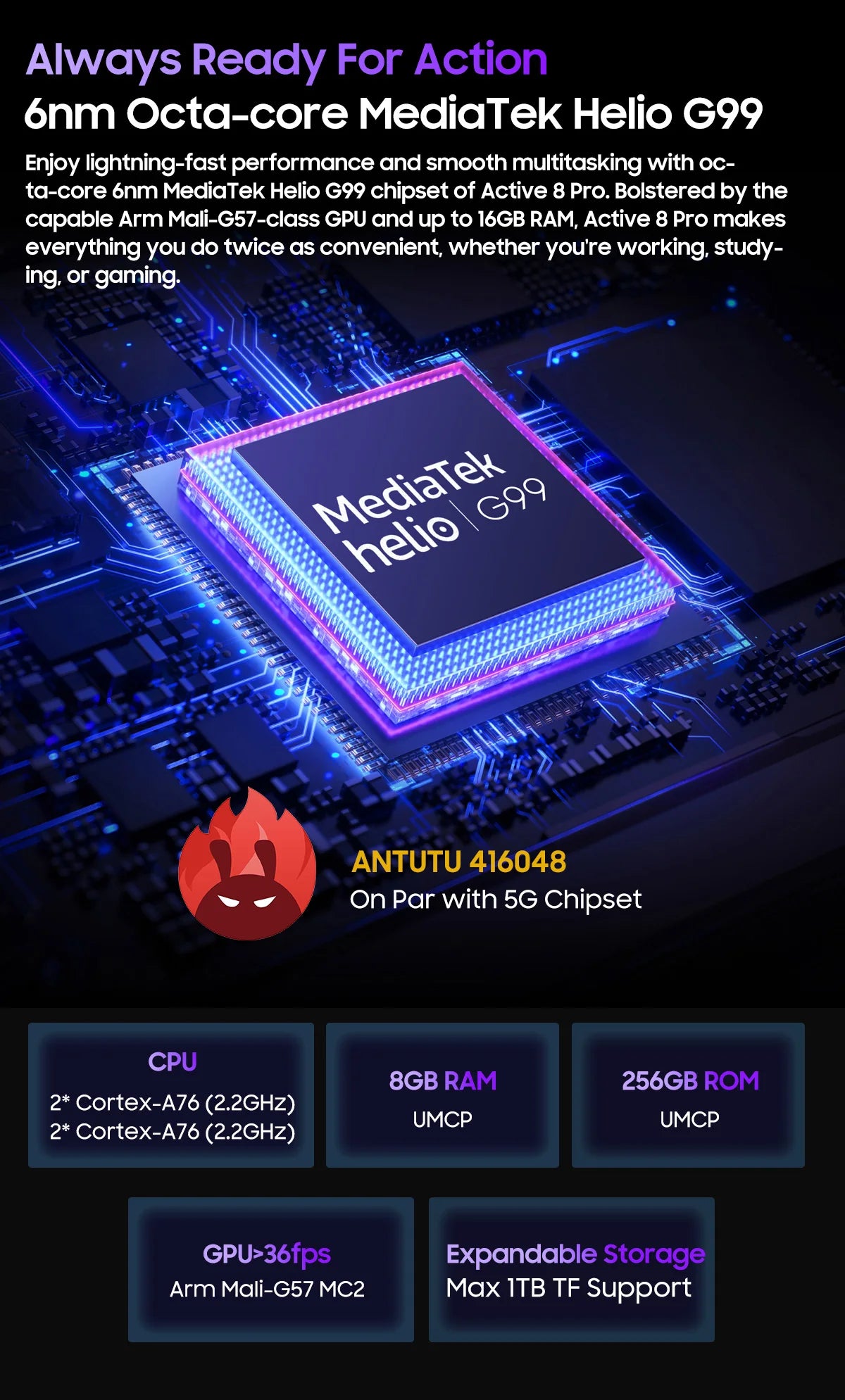 Bénéficiez de performances ultra-rapides et d'un multitâche fluide grâce au chipset octa-core MediaTek Helio G99 6 nm de l'Active 8 Pro. Doté d'un puissant GPU Arm Mali-G57 et de jusqu'à 16 Go de RAM, l'Active 8 Pro vous simplifie la vie, que vous travailliez, étudiiez ou jouiez.