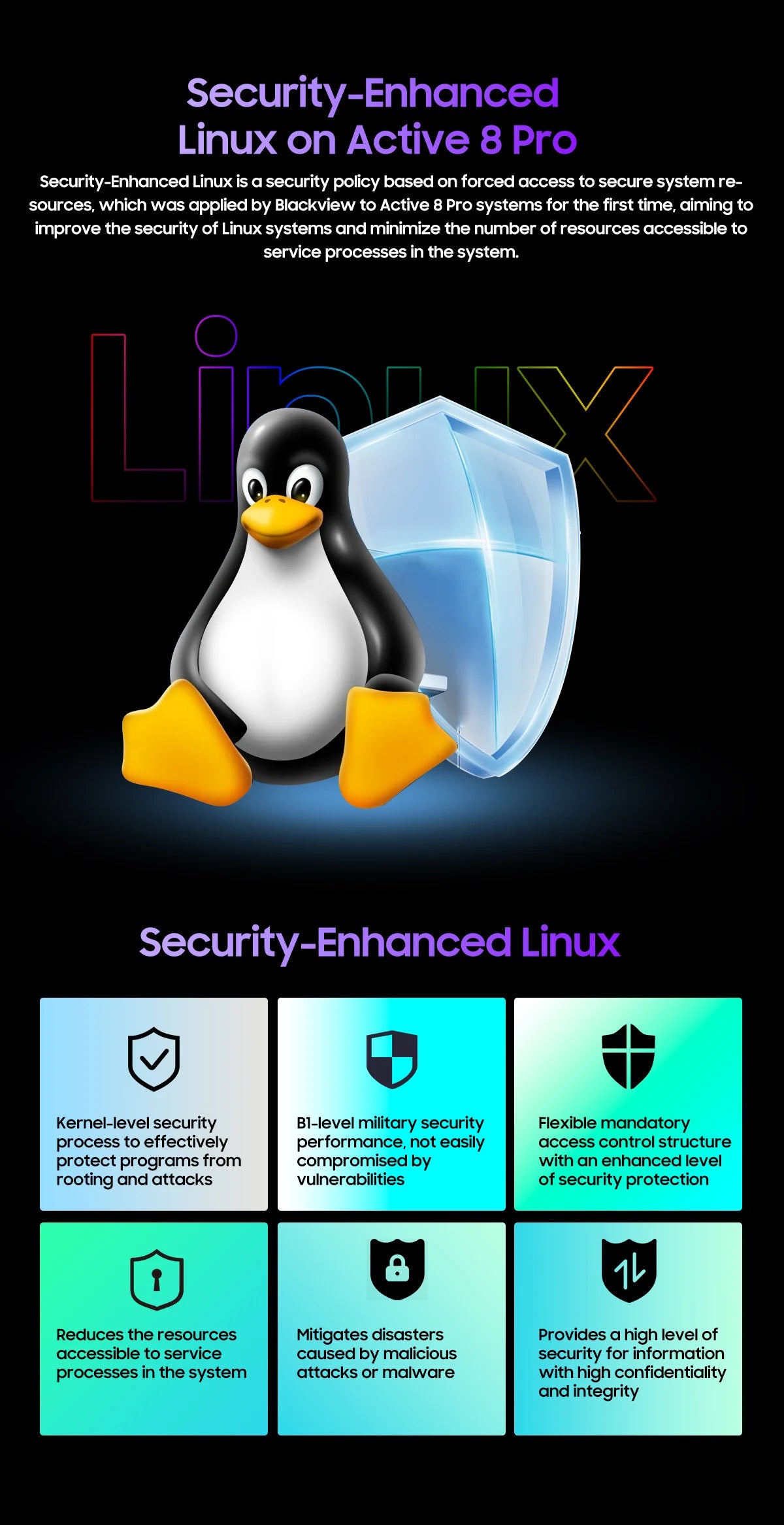 Security-Enhanced Linux est une politique de sécurité basée sur l'accès forcé aux ressources système sécurisées, qui a été appliquée par Blackview aux systèmes Active 8 Pro pour la première fois, dans le but d'améliorer la sécurité des systèmes Linux et de minimiser le nombre de ressources accessibles aux processus de service dans le système.