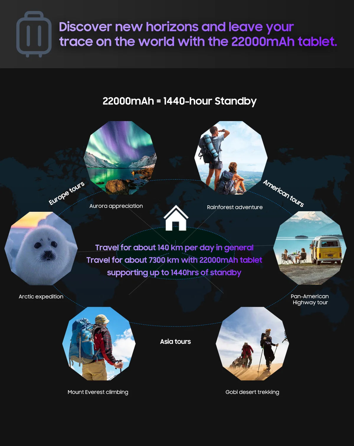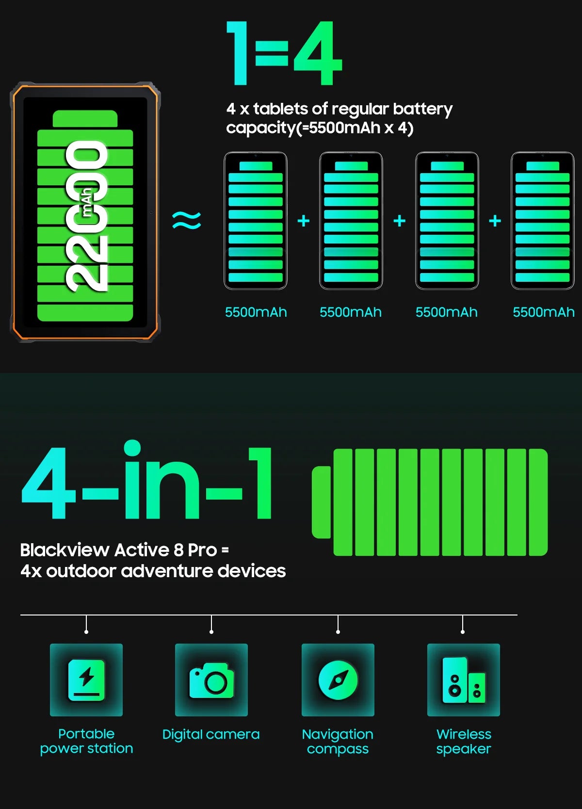 Dites adieu aux soucis de batterie grâce à la gigantesque batterie à semi-conducteurs quatre cellules de 22 000 mAh du Blackview Active 8 Pro. Avec jusqu'à 1 440 heures d'autonomie en veille, vous pouvez explorer la nature pendant des mois sans craindre de tomber en panne d'énergie. Continuez vos déplacements et votre travail avec une productivité et des divertissements ininterrompus.