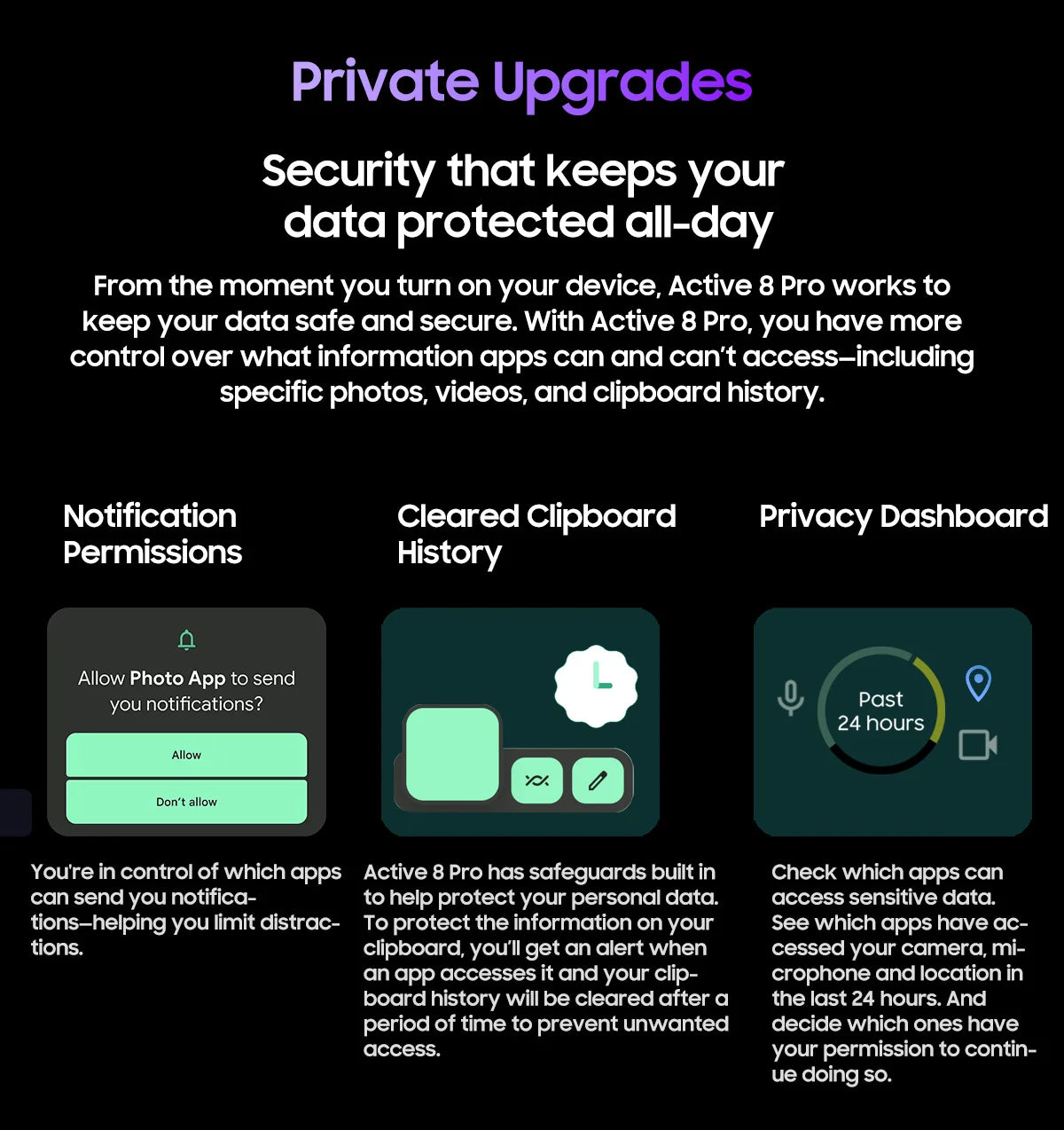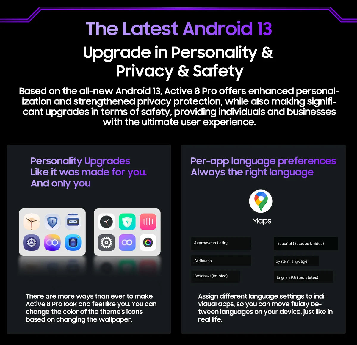 Basé sur le tout nouveau Android 13, Active 8 Pro offre une personnalisation améliorée et une protection renforcée de la confidentialité, tout en apportant des améliorations significatives en termes de sécurité, offrant aux particuliers et aux entreprises l'expérience utilisateur ultime.