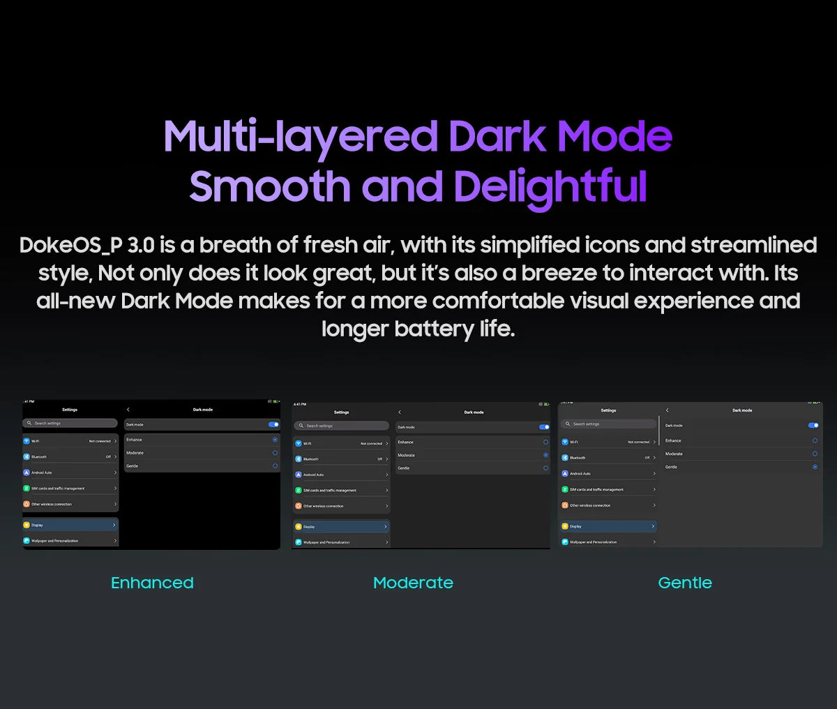 DokeOS_P 3.0 est une véritable bouffée d'air frais, avec ses icônes simplifiées et son style épuré. Non seulement il est élégant, mais il est aussi très facile à utiliser. Son tout nouveau mode sombre offre une expérience visuelle plus confortable et une meilleure autonomie.