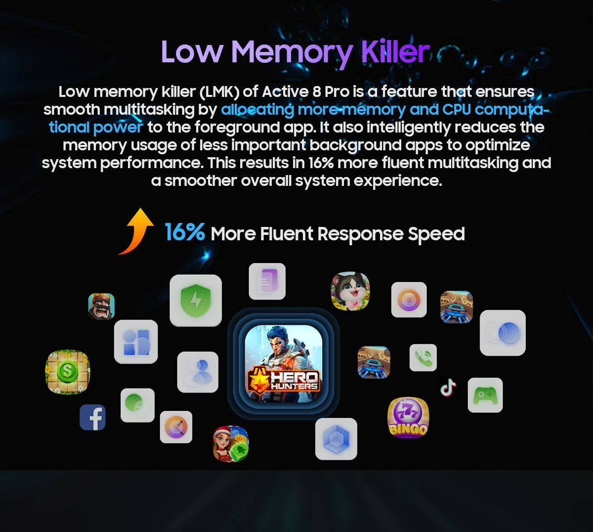 La fonctionnalité Low Memory Killer (LMK) d'Active 8 Pro assure un multitâche fluide en allouant davantage de mémoire et de puissance de calcul CPU à l'application principale. Elle réduit également intelligemment l'utilisation de la mémoire par les applications secondaires en arrière-plan afin d'optimiser les performances du système. Résultat : un multitâche 16 % plus fluide et une expérience système globalement plus fluide.