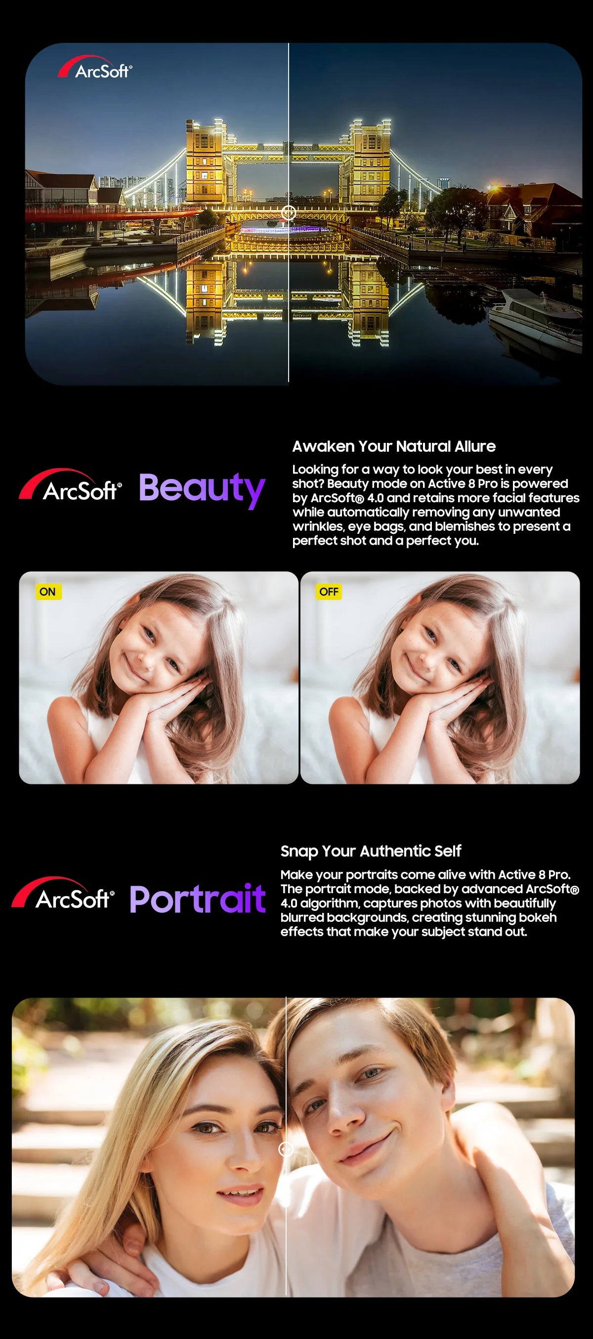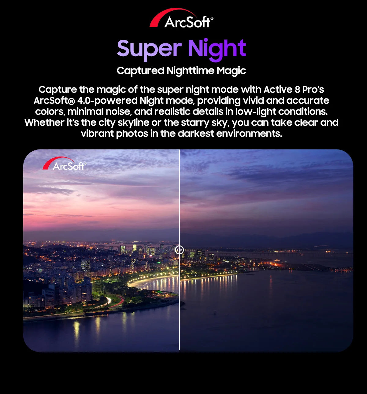 Capturez la magie du mode nuit grâce au mode Nuit optimisé par ArcSoft® 4.0 de l'Active 8 Pro, qui offre des couleurs vives et précises, un bruit minimal et des détails réalistes en basse lumière. Prenez des photos nettes et éclatantes dans les environnements les plus sombres, qu'il s'agisse de la silhouette d'une ville ou d'un ciel étoilé.