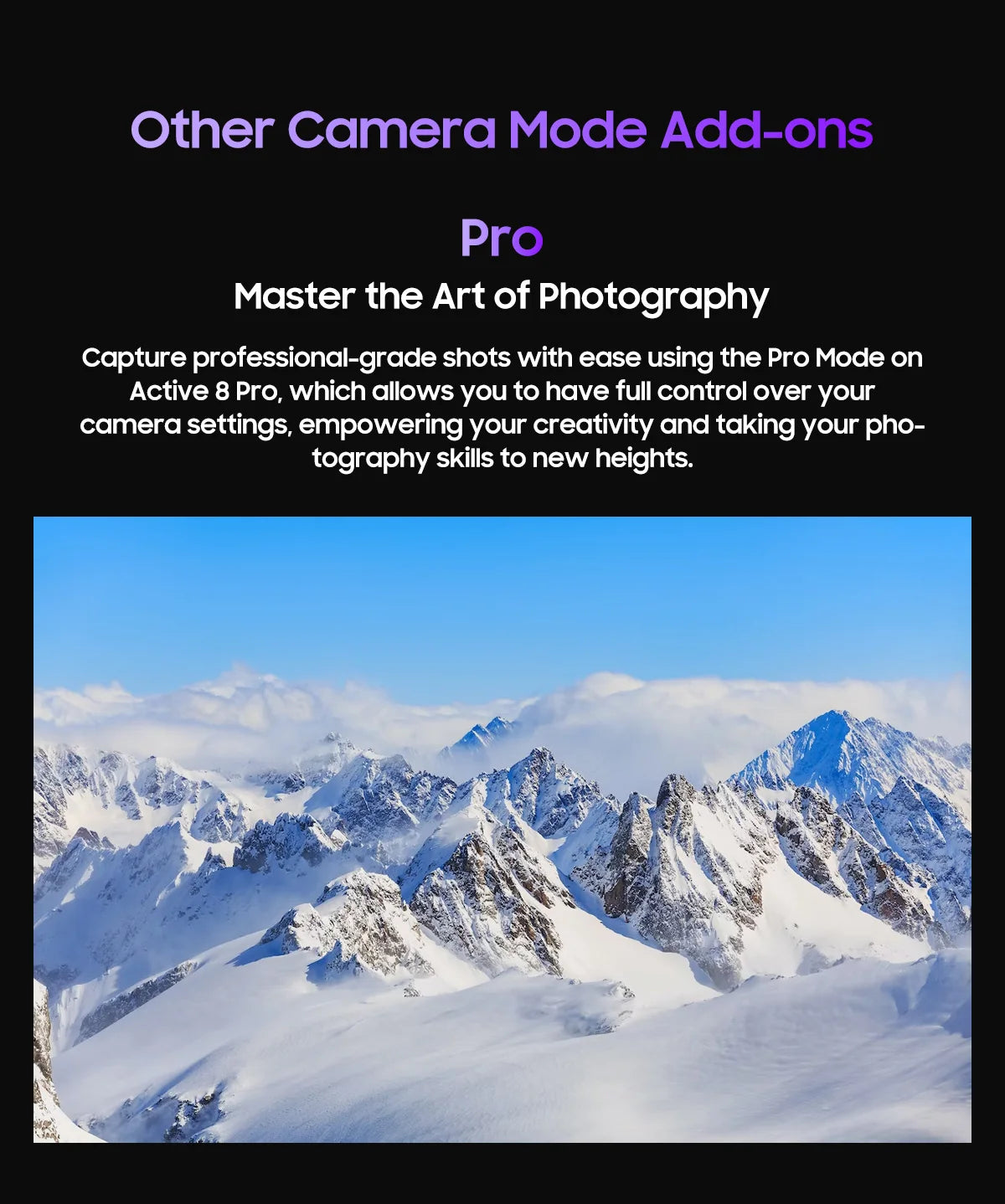 Capturez facilement des photos de qualité professionnelle grâce au mode Pro sur Active 8 Pro, qui vous permet d'avoir un contrôle total sur les paramètres de votre appareil photo, renforçant ainsi votre créativité et portant vos compétences en photographie vers de nouveaux sommets.
