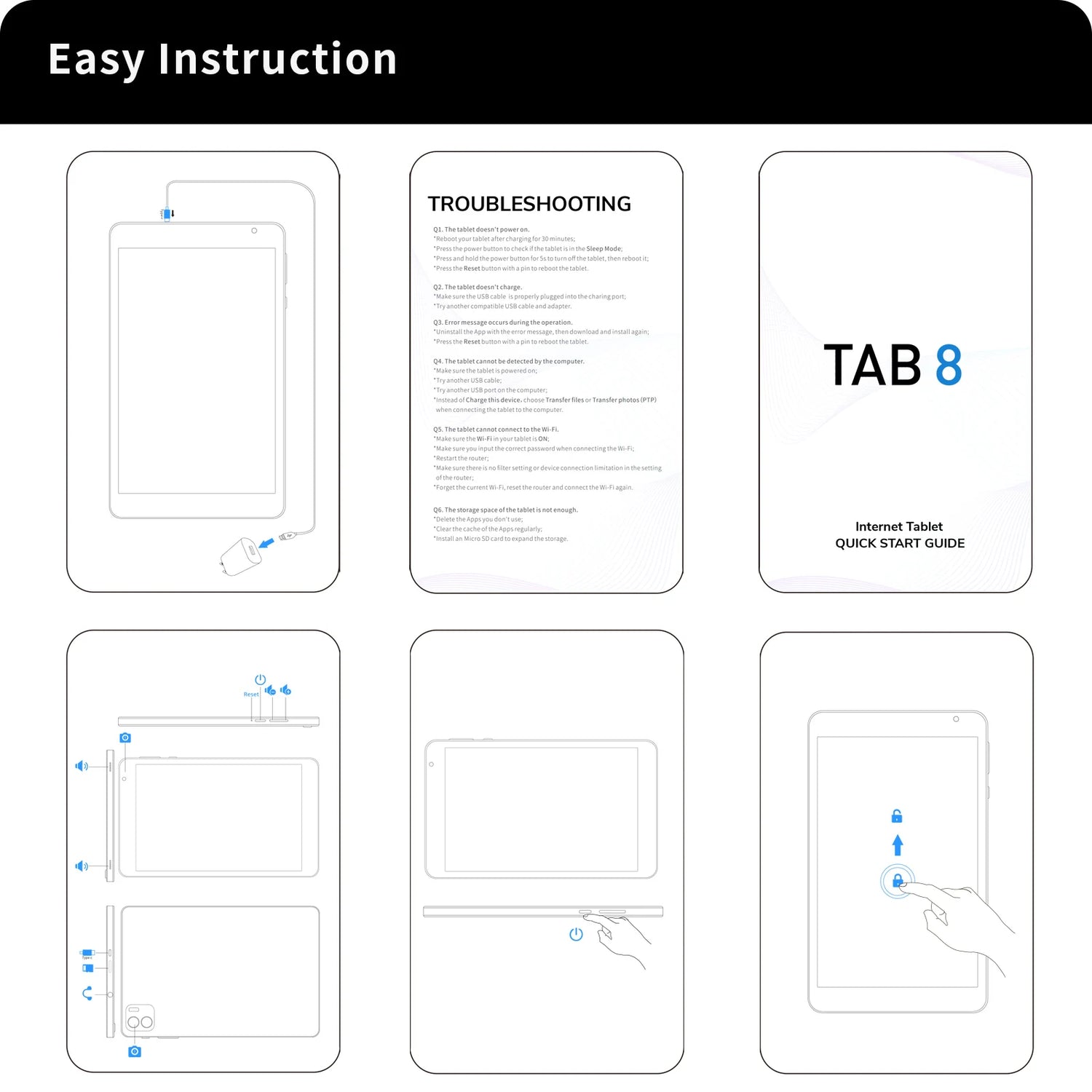 1x tablette PC 8” / 1x chargeur / 1x câble / 1 guide d'utilisation