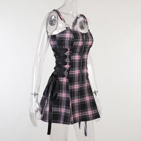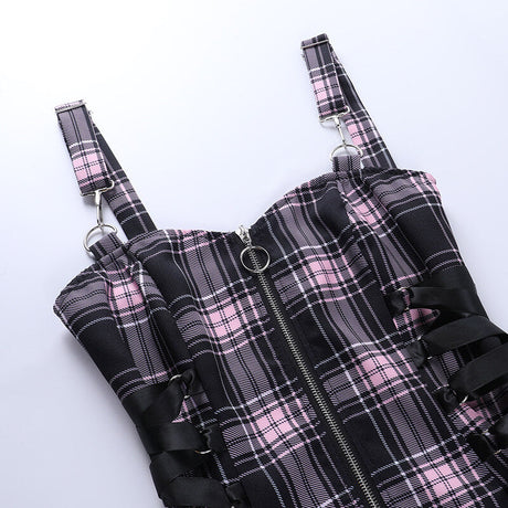 Plaid Chain Zipper Pleated Slip Mini Dress