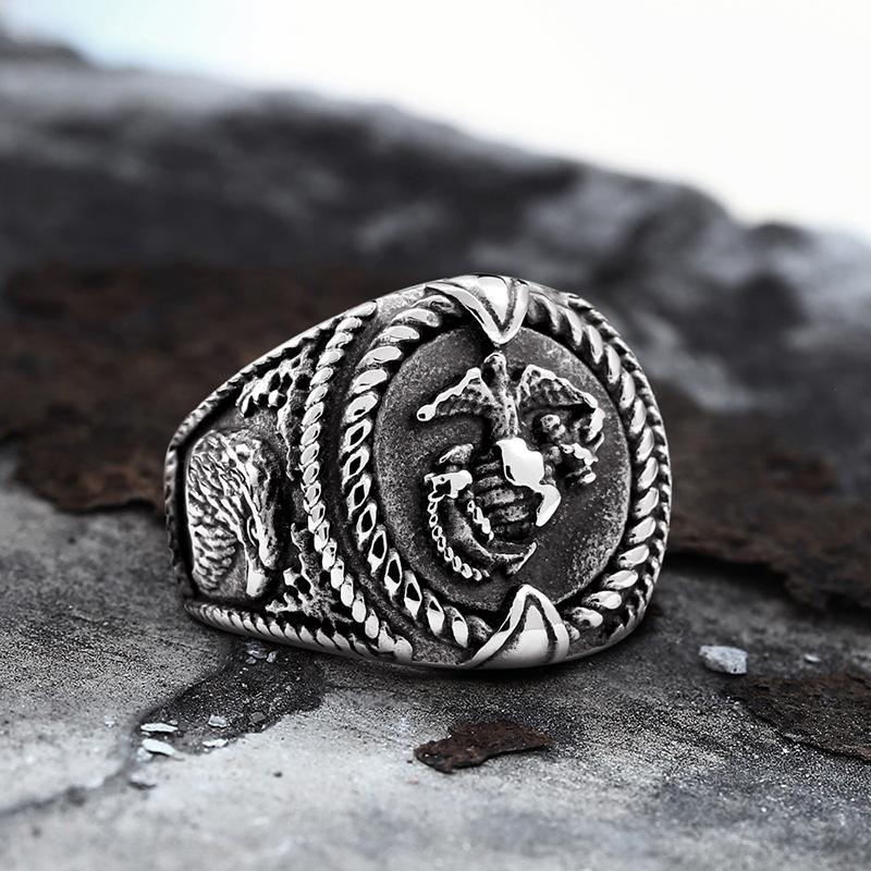 The Eagle, Globe, and Anchor is the official emblem and insignia of the United States Marine Corps. It is commonly referred to as an EGA. This ring is made of stainless steel with the theme pattern of navy anchor that creates a look that is both elegant and rugged, making it great for any biker. Men's stainless steel ring, marine anchor ring. It is a comfortable yet masculine ring, one that you will not be disappointed with. Get yours today!
