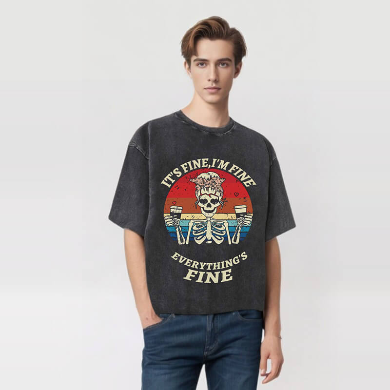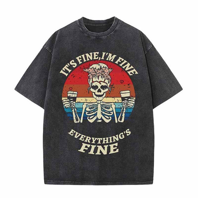 Stay cool and stylish with our Everything Is Fine Skull T-shirt. Made with high-quality, breathable fabric, this shirt features the statement "IT'S FINE, I'M FINE, EVERYTHING'S FINE". Perfect for those who want to make a statement without saying a word. Stay confident and cool with our unique design.