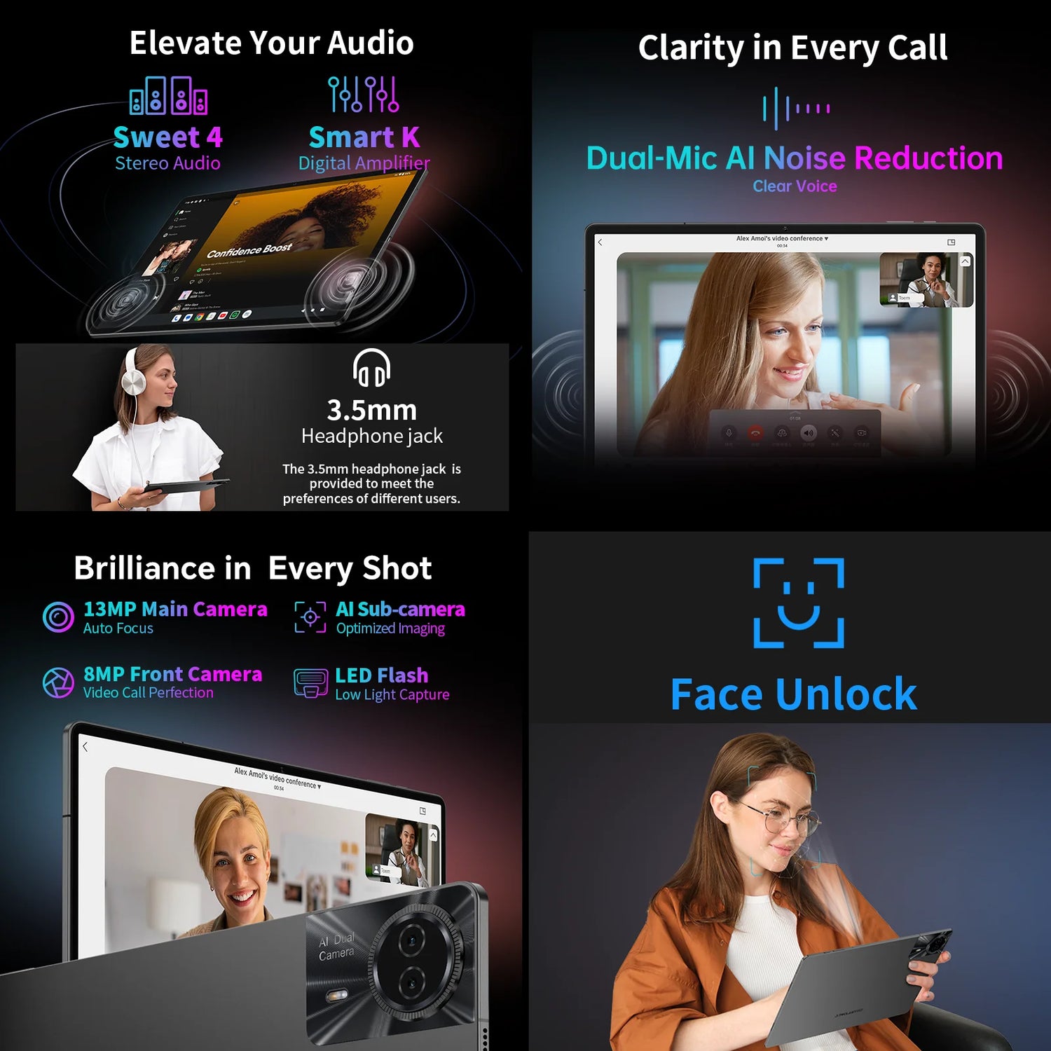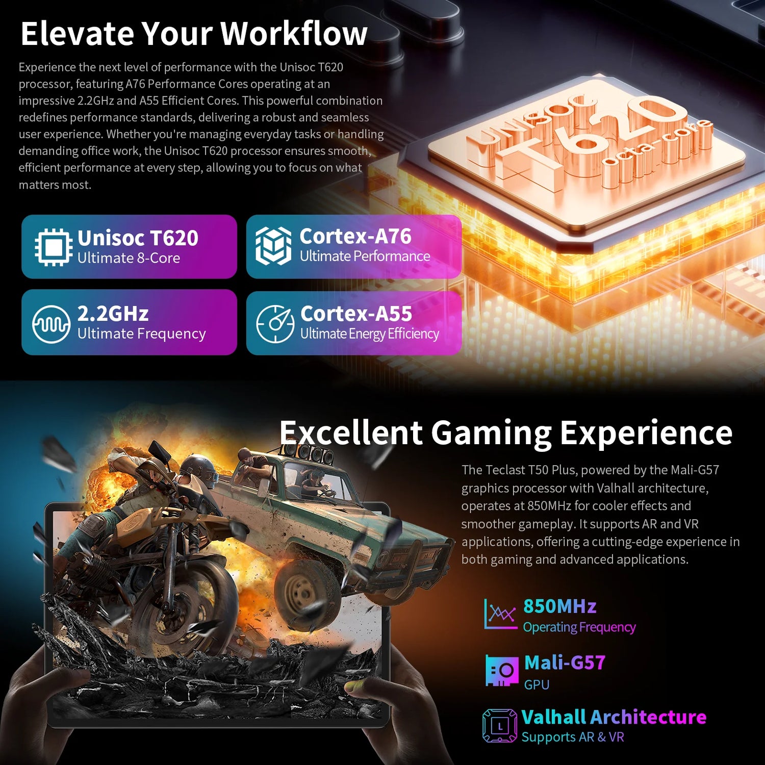 Tablette Teclast T50 Plus, 11 pouces, processeur Unisoc T620, 8 cœurs, (6 Go + 10 Go), RAM max. 16 Go, ROM 256 Go, réseau 4G, double SIM, Android 14, 8 000 mAh, IPS 1920 x 1200, Wi-Fi