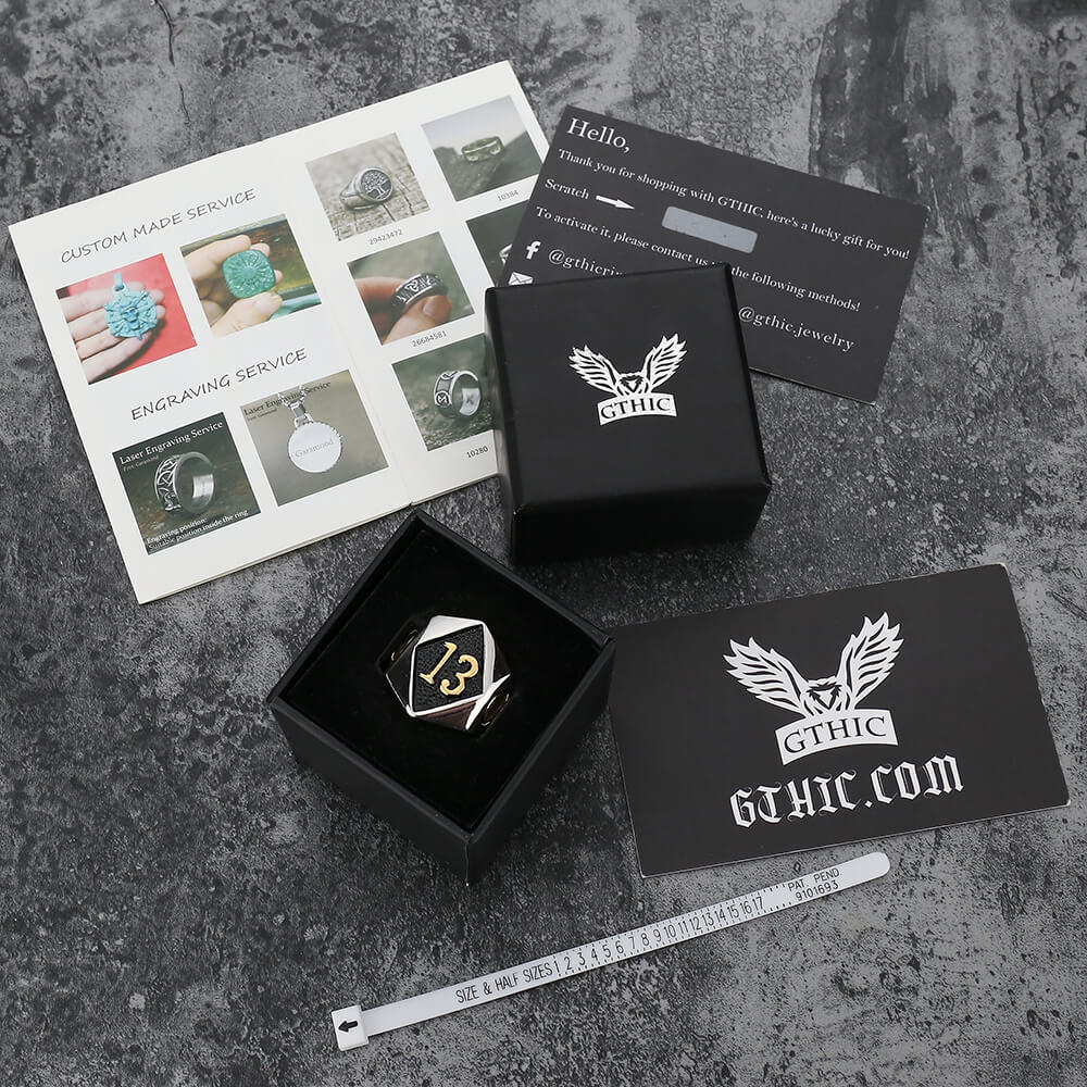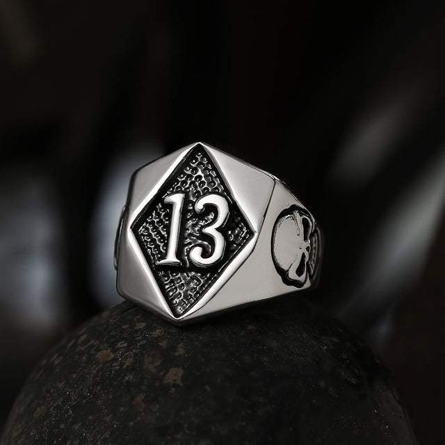 13 is a special number. The Great Seal of the United States features several groupings which consist of 13 things of the same type e.g. 13 olive leaves, 13 stars, 13 arrows. Some people see 13 as a lucky number, and some see 13 as an unfortunate number. Everyone has a different view. We carved the special number 13 on the ring. Solid, and durable, we provide first-class jewelry that won’t lose its luster over time. Add it to your shopping cart!