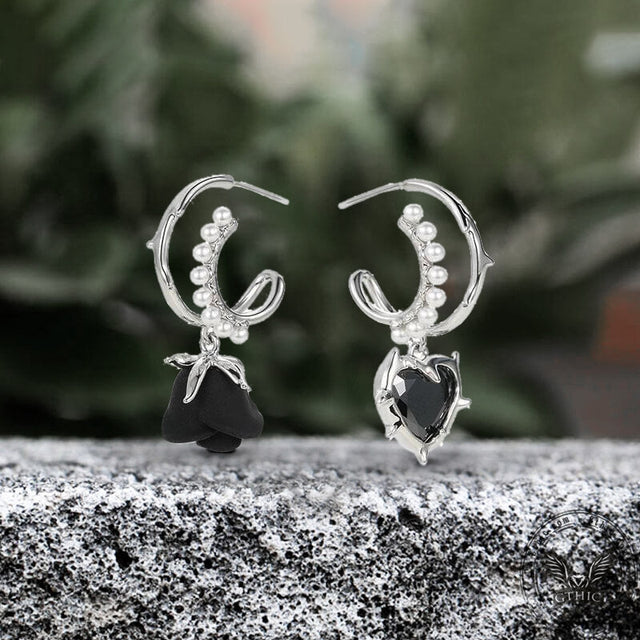 Asymmetric Heart Rose Zircon Stainless Steel Stud Earrings - Black / A pair is backordered and will ship as soon as it is back in stock.
