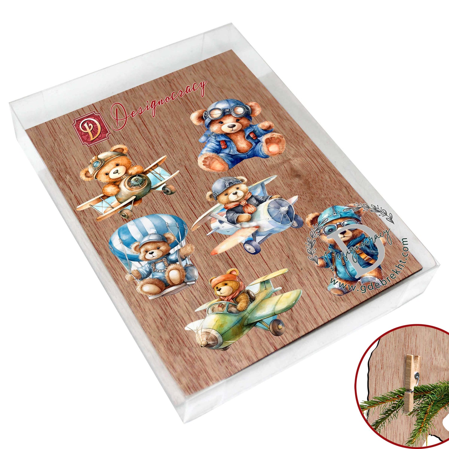 Aviator Teddy Bear Decorative Wooden Clip-on Ornaments of 6 by G. Debrekht - Christmas Decor - 8090010C-S6