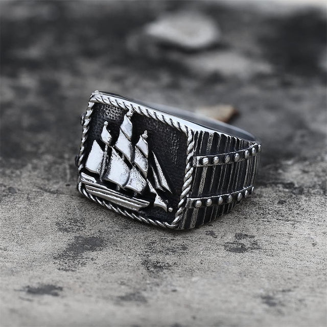 Barque is a type of sailing vessel with three or more masts having the fore- and mainmasts rigged square and only the mizzen (the aftmost mast) rigged fore and aft. We moved an entire sailboat to our ring. Oxidized retro craftsmanship gives the ring a sense of fashion. If you are a sailing fan, then our ring is perfect for you. It is a comfortable yet masculine ring, one that you will not be disappointed with. Get yours today!