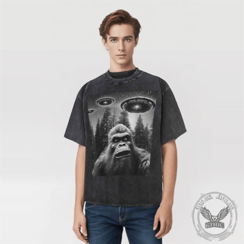 Embark on a journey into the unknown with our Bigfoot Sasquatch Alien UFO Print T-shirt. Crafted from premium cotton, this tee features an intriguing design that sparks curiosity and invites exploration. Whether you're a skeptic or a believer, join the conspiracy and express your fascination with the mysteries of the universe in style.