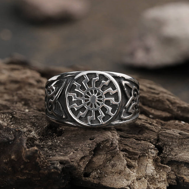 The Black Sun is a Nazi symbol, a type of sun wheel. The Sun Wheel symbol is believed to invoke the great cosmic powers to bless the Earth with fertility, life, abundance, prosperity, and peace. The Celtic knot is both a work of art and equally rich and beautiful in its symbolism. The combination of the two makes this ring complement your charm in both appearance and symbolism.