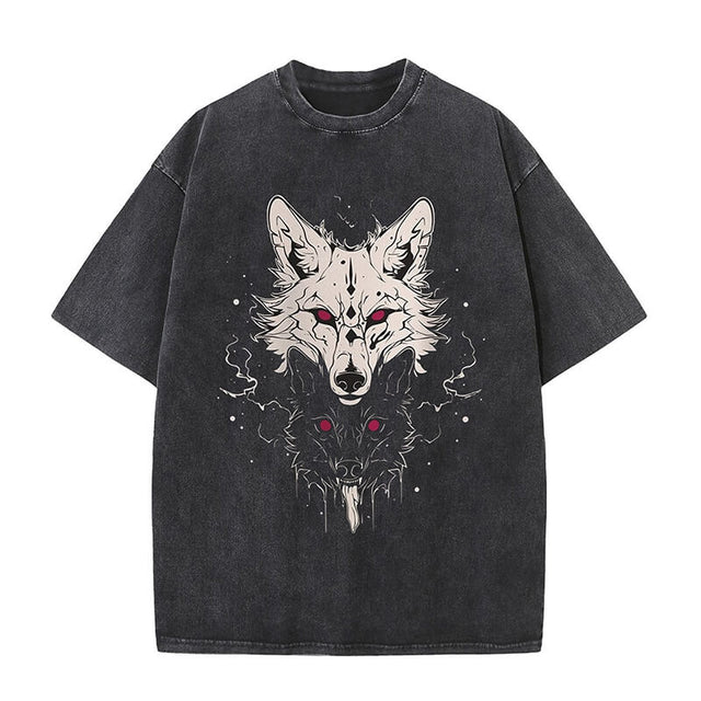 This washed t-shirt features a bold and striking wolf print, showcasing a unique blend of light and dark elements. Embrace your wild side with its two-sided design, perfect for making a statement. Add a touch of edge to your wardrobe with this must-have piece.