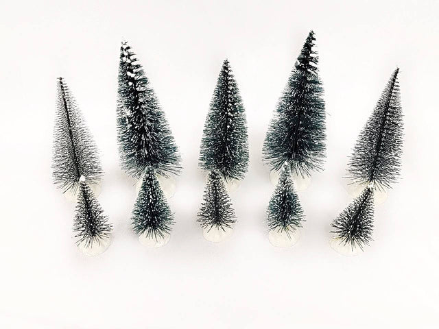 Complete your winter village scene with these miniature pine trees, lightly frosted to create a snowy effect. These trees add a natural touch and enhance the realism of your display, perfect for framing your holiday scenes or creating a winter landscape.