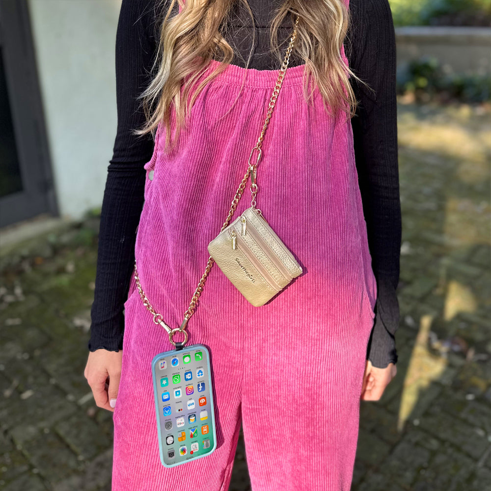 The Clip & Go Chain offers a sophisticated way to carry your smartphone, combining fashion with practicality. This adjustable crossbody chain allows your phone to hang securely at your side, keeping it accessible while leaving your hands free. The included zippered pouch provides space for essentials like cash, credit cards, and small items, making it perfect for daily use or special occasions.