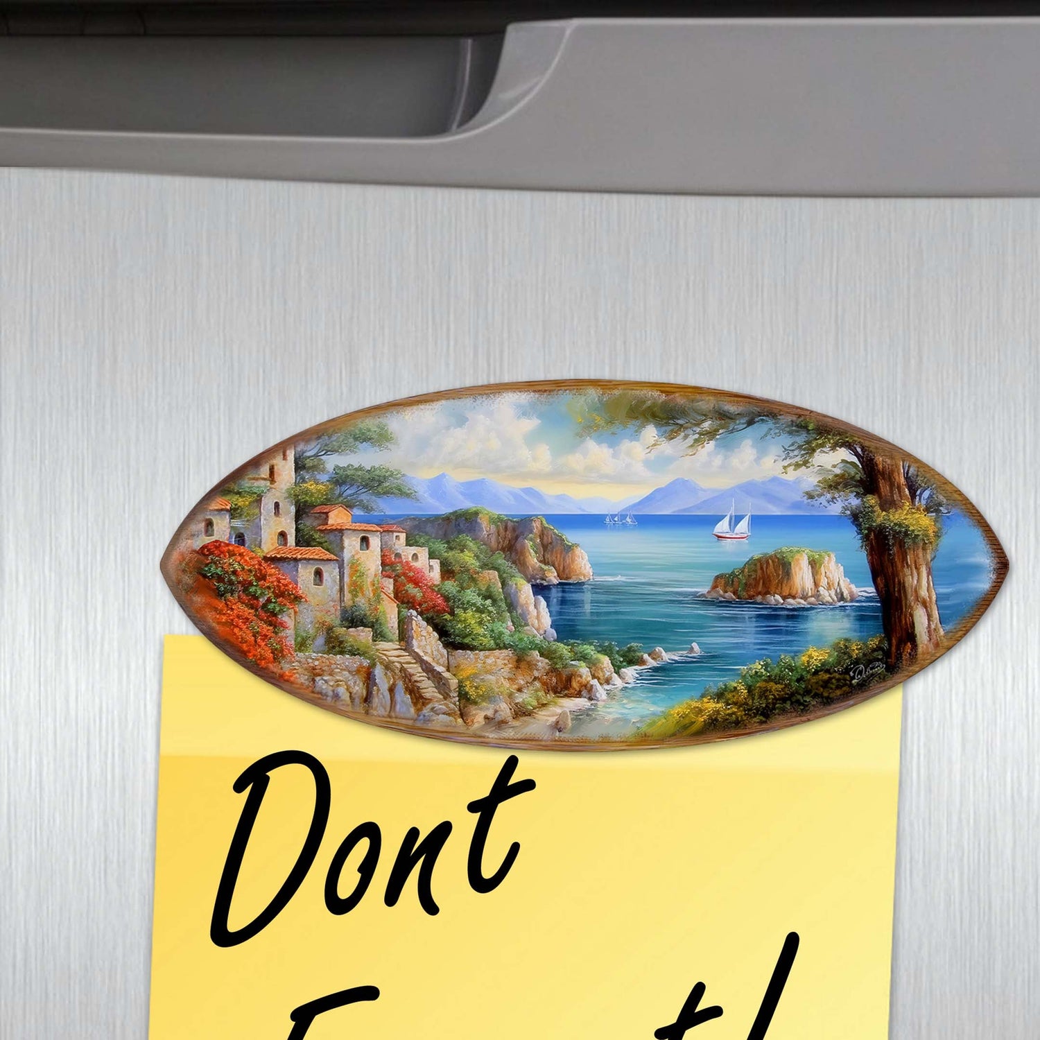 Add a touch of coastal charm to your home decor with this set of 6 decorative wooden magnets featuring surfboard designs. Made by G. Debrekht, these magnets are perfect for adding a beachy vibe to your fridge or any magnetic surface. Bring the ocean into your home with these unique and stylish magnets.