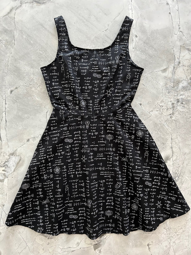 Fun, flirty, and totally retro: our skater dress is the perfect addition to your closet! Shown in our equations print, this vintage inspired dress features a scoop front and back, elasticized waist in the back for ease of wear, a flirty a-line skirt with hidden side pockets, and a back zippered closure.