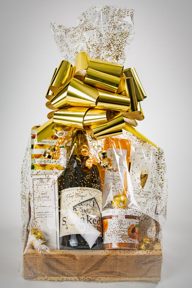 Wooden keepsake container includes a 750ml Bottle of Wine, Bar of Cheddar Cheese, Freeze Dried Apricots, Handfuel ( Dry Roasted Spanish Almonds with Seasalt and a squeeze of lemon) ,Beef Summer Sausage, Vanilla Sugar Cone Crisps, and 2 Lindor Chocolates!