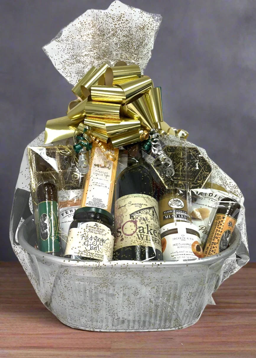 Includes a stonewall kitchen jam with Pepperidge Farm crackers, brie cheese spread, 2 sausages, bar of cheddar cheese, spicy mustard, 3oz bag of honey roasted peanuts, freeze dried apricots, Box of salted caramels, 6oz bag of salted peanuts, seasoned pretzels, and finish it off with a bottle of Soaked winery wine ( Merlot, Cabernet Sauvignon, Pino Grigio, Blush (Cameo), or Riesling Available).