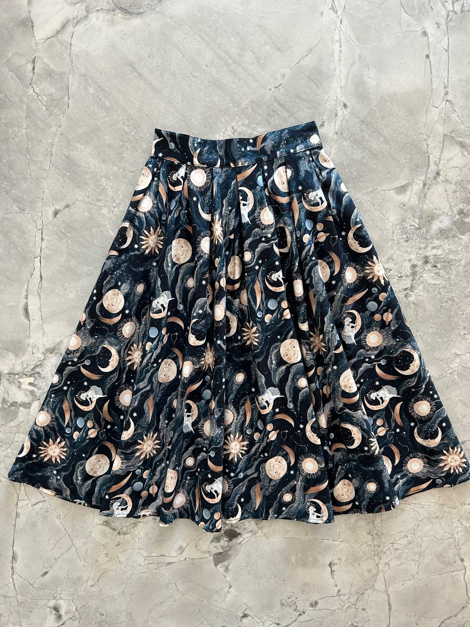 Our stunning Luna Doris skirt allows you to wear the beauty of the night sky and the cosmos wherever you go.  It is adorned with a mesmerizing celestial print that captures the magic of the night sky and is a tribute to the endless wonders of the universe. Wear it with confidence and let your style shine as brightly as the stars.