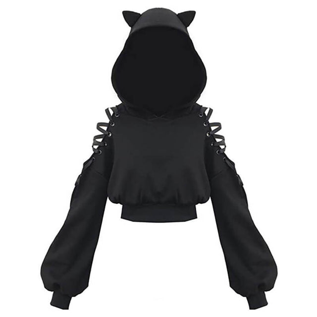 Experience edgy and unique style with our Punk Cat Ear Off Tie up Hoodie. Made for rebels, this trendy hoodie features cat ears and a tie up design for a daring look. Perfect for adding a touch of punk to any outfit. Embrace your inner feline with this bold and fashionable hoodie.