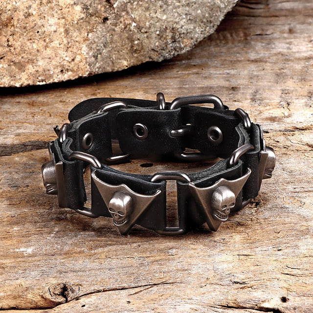 Embrace your inner rebel with our Punk Skull Head PU Leather Adjustable Bracelet. Featuring a detailed zinc alloy skull, this durable and comfortable accessory adds a bold touch to any outfit. Perfect for any occasion, its adjustable design ensures a perfect fit. Unleash your style today.