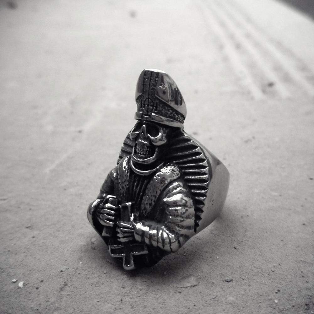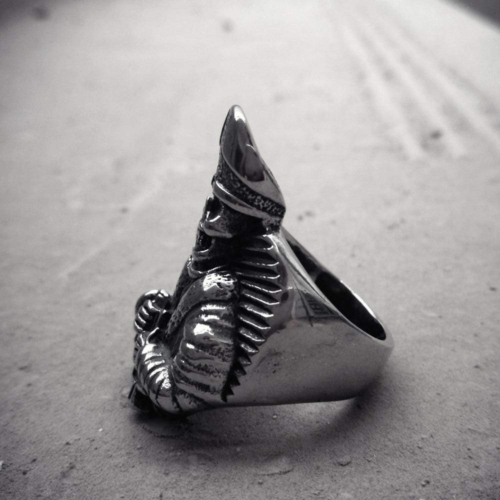 One of our more intricate skull designs, this wickedly stunning ring is fierce and sinister, sure to induce nightmares for those of a more delicate nature. This one of a kind ring combines three of the most widely recognized biker symbols- skulls, crosses, and pharaoh. Intricately designed and carved by expert craftsmen, this ring is a must-have for any biker ring collection.