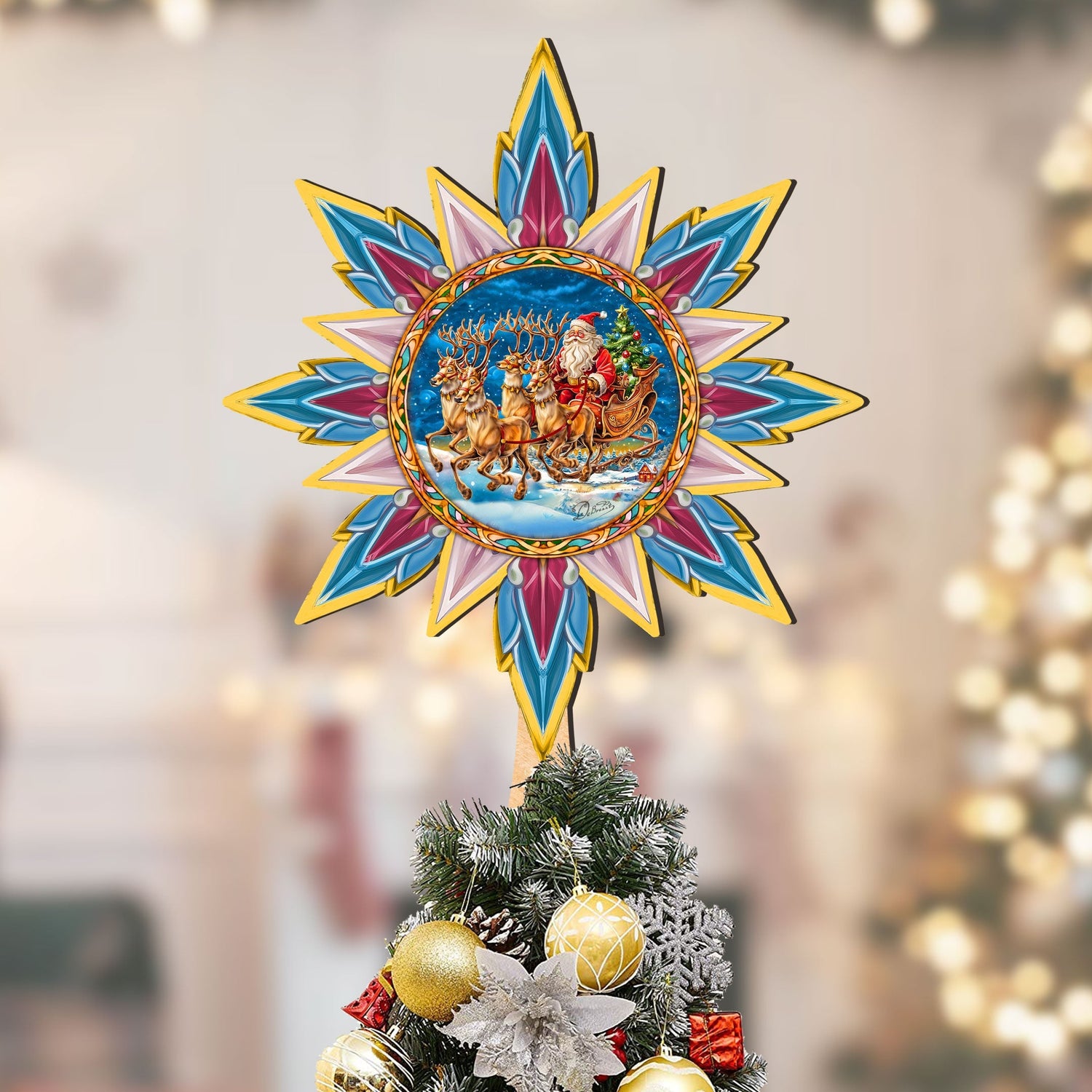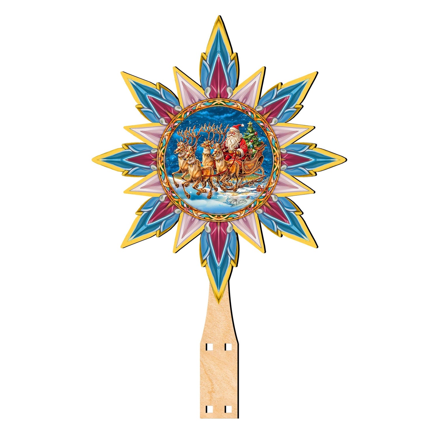 Santa on the Sleigh Star Tree Topper Wooden Decor by G. Debrekht - Santa Snowman Decor - 89516