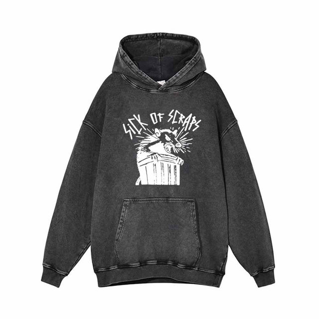 This vintage washed hoodie features an embossed "Sick Of Scraps" mouse design, providing a unique and stylish look. The soft fabric ensures comfort, while the vintage wash adds a worn-in feel. Perfect for those looking for a statement piece with a touch of nostalgia.