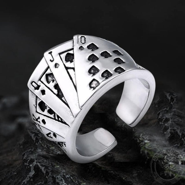 This ring is made of stainless steel with the theme pattern of straight flush playing cards. Straight flush means a poker hand that is both straight (the cards are all in sequence) and flush (the cards are all of the same suit). Solid and durable, we provide first-class jewelry that won’t lose its luster over time. Get yours today!