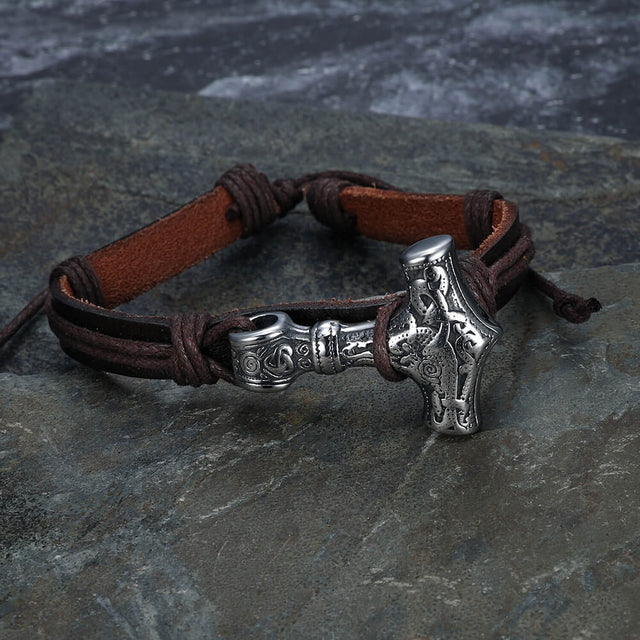 Thor’s Hammer Stainless Steel Leather Viking Bracelet