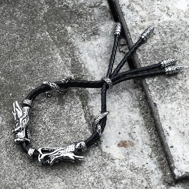 Vintage Double Dragon Stainless Steel Leather Animal Bracelet
